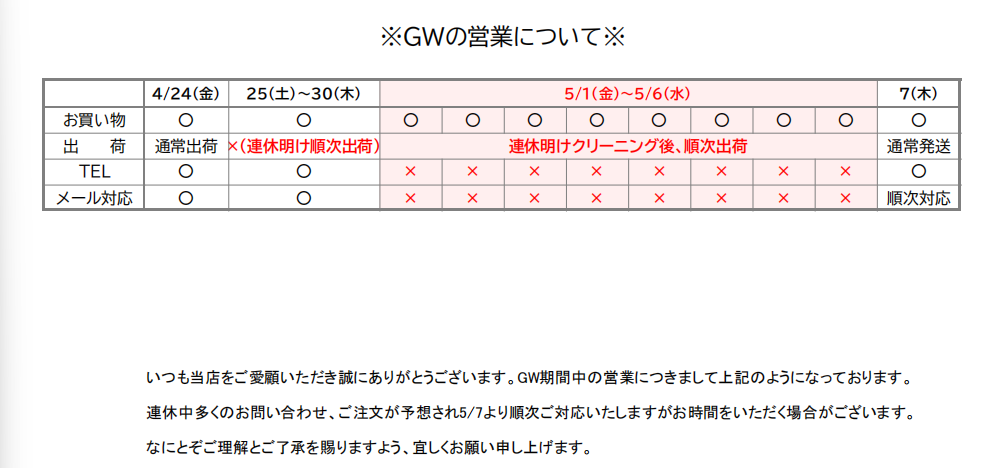 当店ではご注文いただいてから最終メンテナンスとクリーニングを行いますので出荷までに3日~5日程お時間をいただいております。