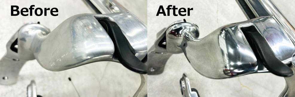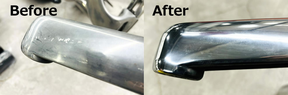 また、傷はありませんが拭いても取れない白いくすみ、斑点模様の状態でも磨き作業によりここまでピカピカにします。